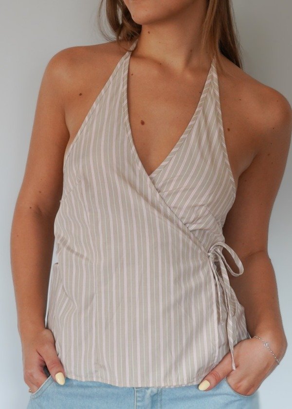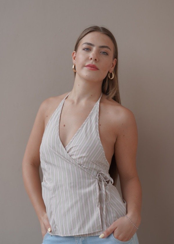 Top halter escote en V cruzado, tiras para atar en el cuello (tiras internas para ajustar cintura). Confeccionado en camisero catalina - símil poplin.